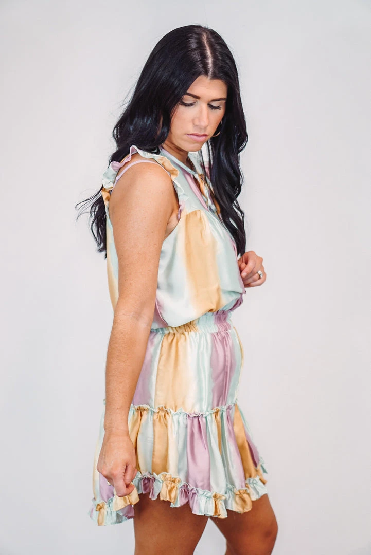 Oh my ombre!! Obsessed with everything about this tiered ruffle dress! Features a self tie neckline, elastic waistband & tiered skirt. Color: light camel, mint & mauve. An Adrienne exclusive print.