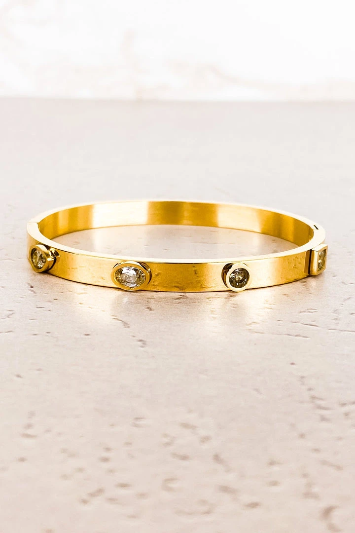 This bangle is the cutest! The bangle features a gold band with a variety of rhinestones. Style this cutie with your other gold jewelry pieces for the ultimate stack.