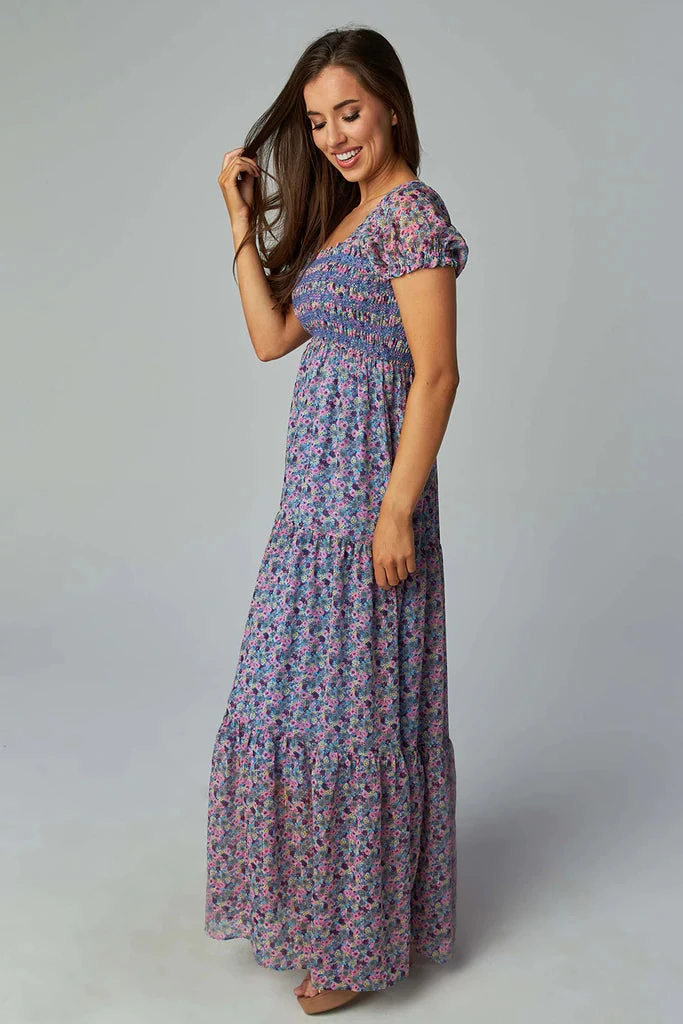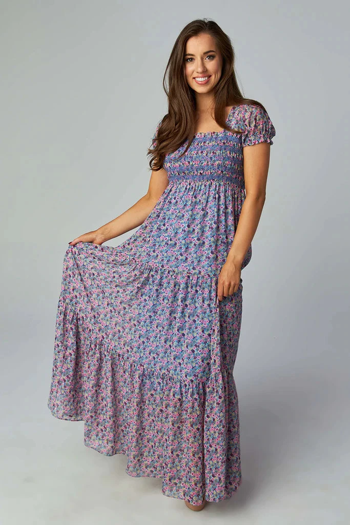 Calling all maxi dress lovers! The Hattie is a LOOK. She features a smocked bodice with a short flattering puffy sleeve, and large tiers down to the ground. Pair her with a big hat and an arm full of bangles for a cute boho look. Colors: metallic gold, blue, pink, burgundy, teal, grey, and yellow. Shop the matching kids dress for a perfect Mom and me day out: Youth Kenzie dress in pasture.
