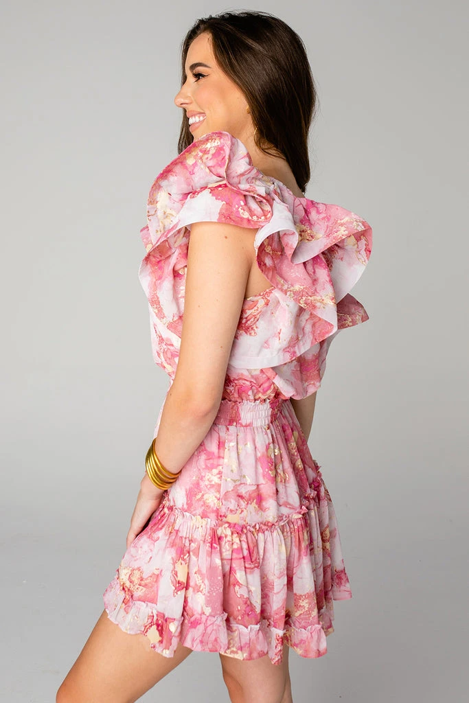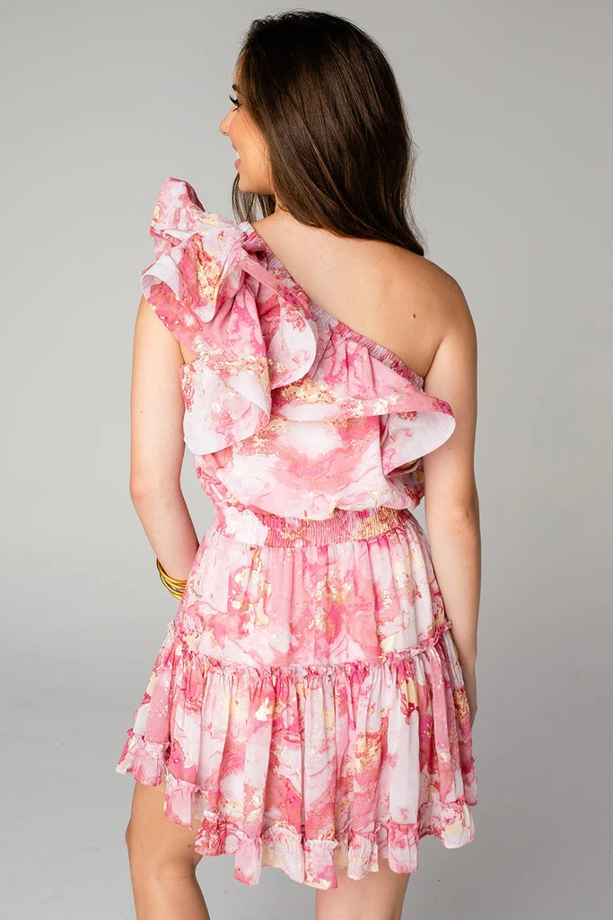 Party like a rockstar in the new Sofia dress! This dress is perfect for any event- baby shower, bridal shower, wedding, birthday party…you name it, you can wear the Sofia. She features a ruffled one shoulder look, elastic waist, and ruffled skirt. Add your favorite strappy heels, earrings, and your hair in a low bun or ponytail for a glamorous look! Zap: light pink, dark pink, mauve, and metallic gold.