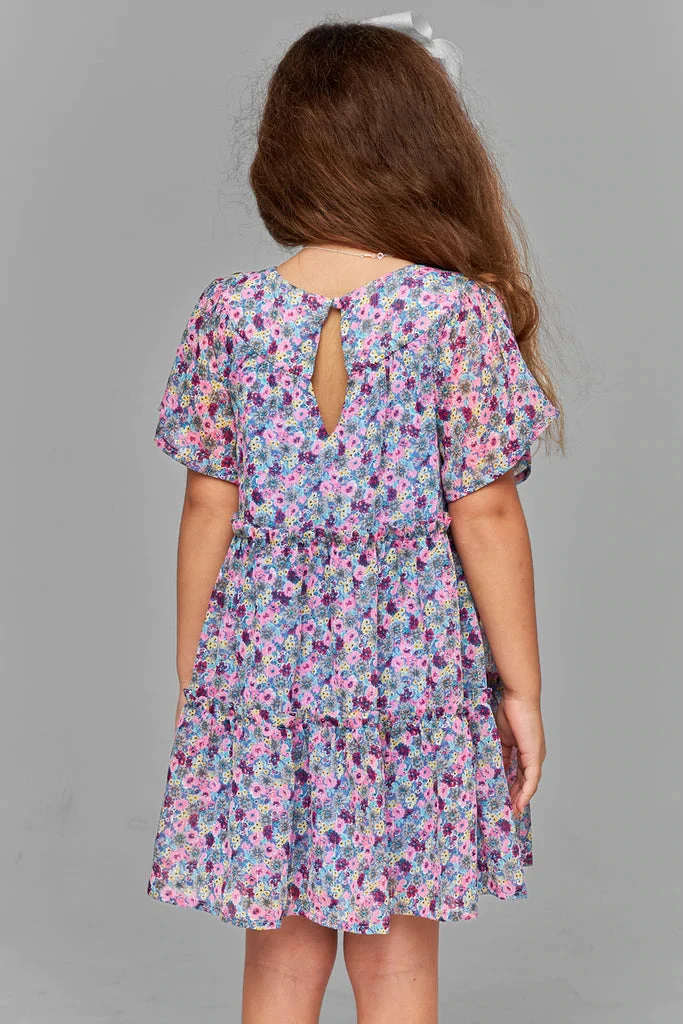 Your little one will love to match Mama in this super cute Kenzie dress! This a-line floral print dress features layered tiers, short flounce sleeves, and crew neckline with keyhole button closure in back. Colors: metallic gold, blue, pink, burgundy, teal, grey, and yellow. Pair with Mom’s matching dress for a perfect Mom and me day out: Hattie dress in pasture.