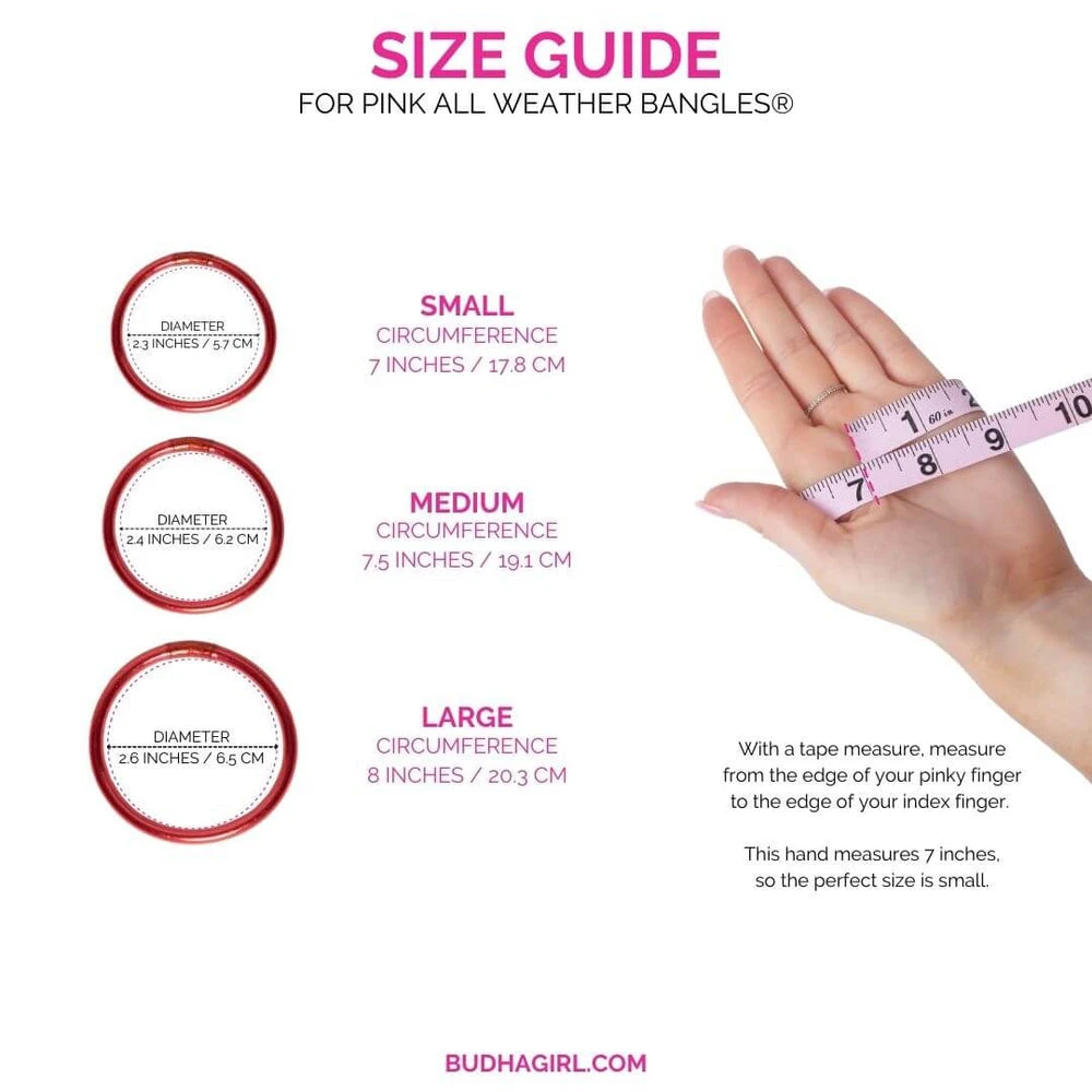 BuDhaGirl Pink All Weather Bangles are made of polyvinyl carbonate tubing that is a semi-flexible material, so there is a little give when you slide the bangles over your hand. This really is the key to deciding your size… how the bangles go over your hand, not the size of your wrist.