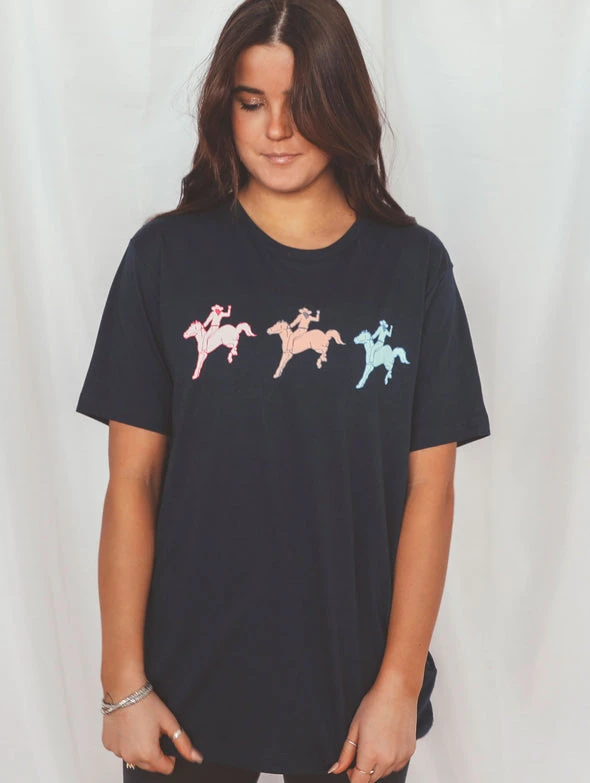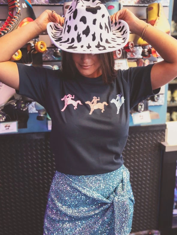 It’s definitely not our first rodeo! This fun tee features a neon rider design on a navy background. This will be perfect for all of your Nashville weekends or cowgirl themed parties!