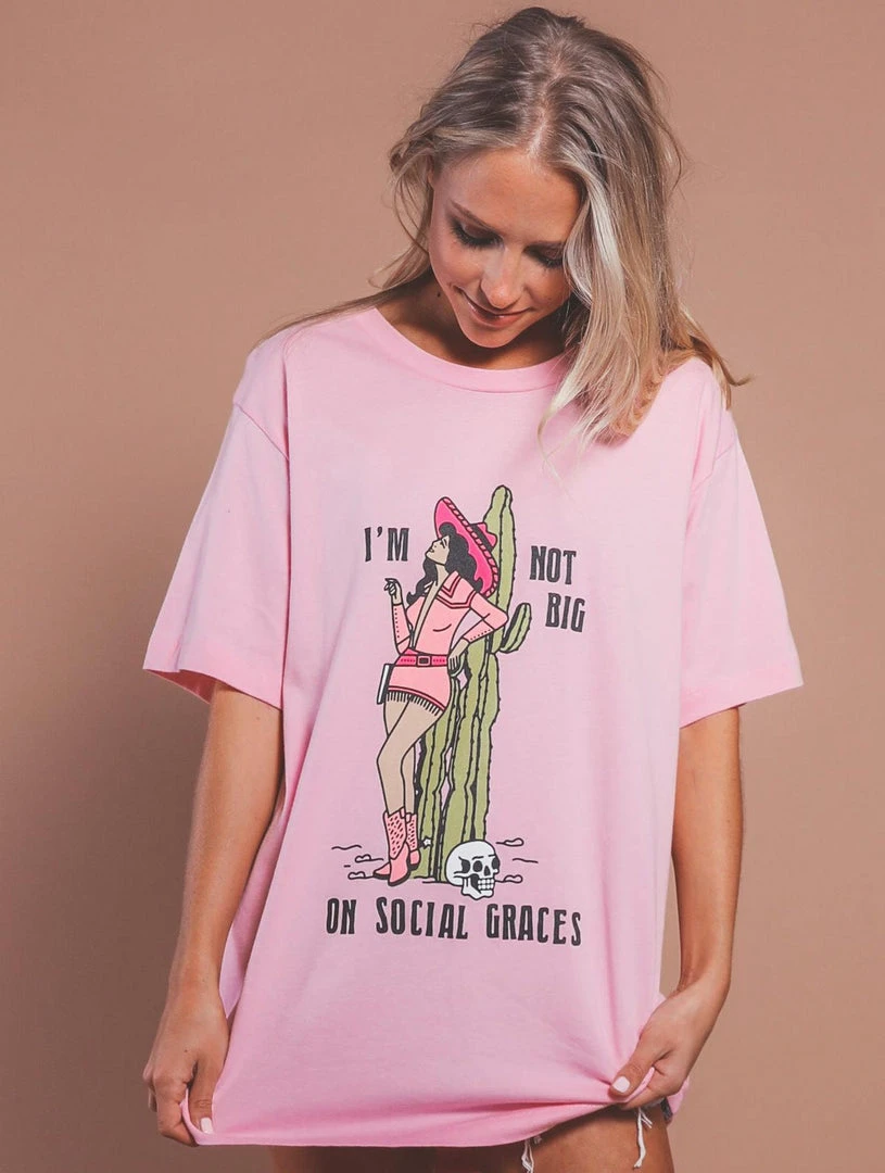 If you aren’t big into social graces then you should slip into this oasis of a tee! Show off your baddie side with this pink tee featuring our inner cowgirl scene. You will have everyone singing along with you in this tee. A Garth Brooks classic that you need for your country concerts this summer!