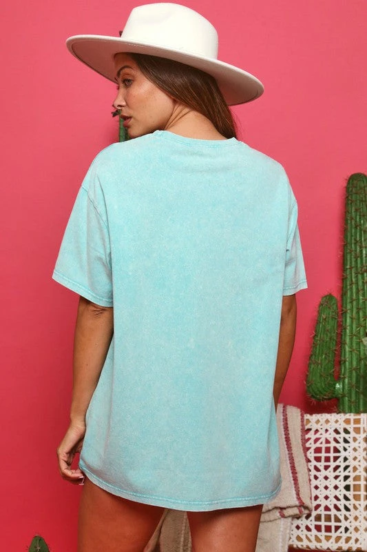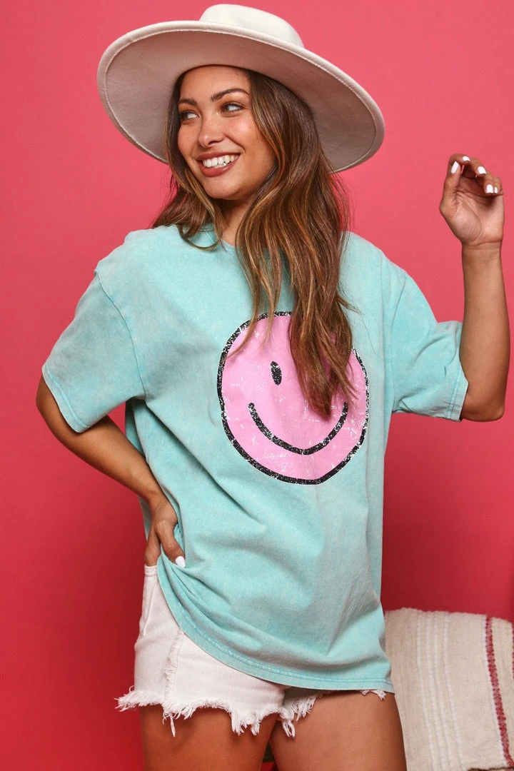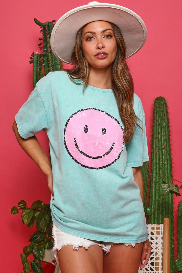 Trendy mineral washed turquoise graphic tee with the iconic smiley face in pink. The oversized fit makes this babe easy to pair with your distressed jeans, leggings, or favorite biker shorts. So cute and fun!
