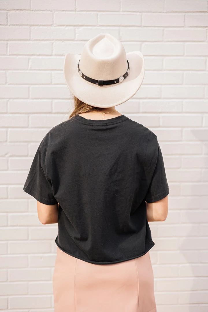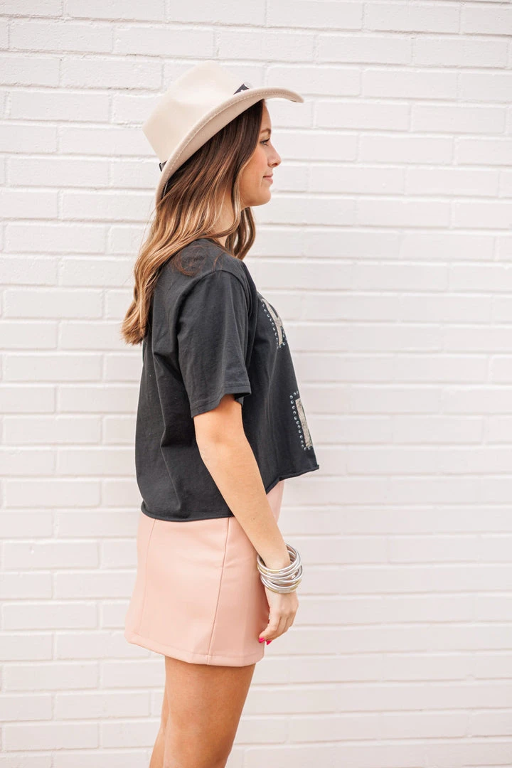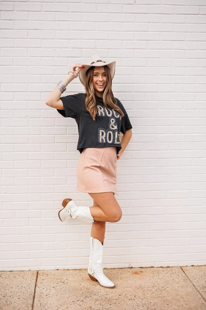 One of our favorite tees! We are loving the Rock & Roll punch out graphics… pair with your favorite jean shorts and star sneakers or boots for a fun and trendy look. This fun cropped top is a must have for any Rock & Roll fan!