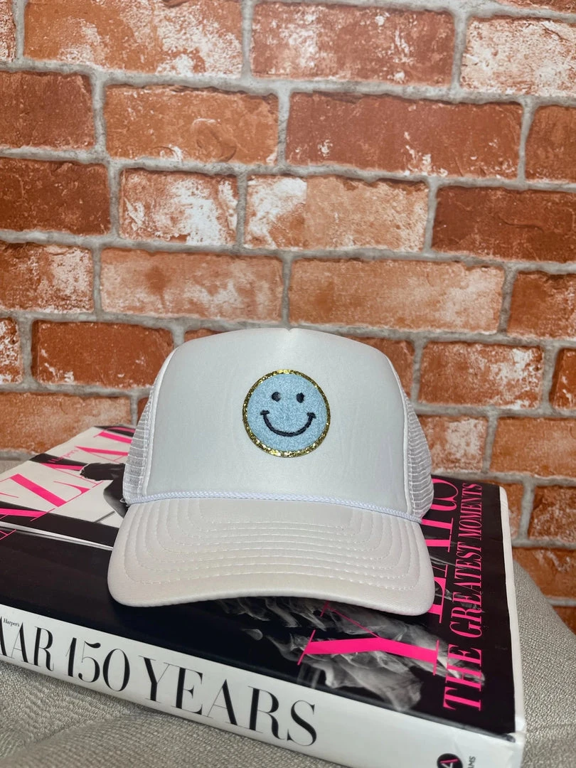 Stay smiling everyday in the cutest white and blue smiley face truckers cap! Smile Face Trucker Hat, Adjustable Strap