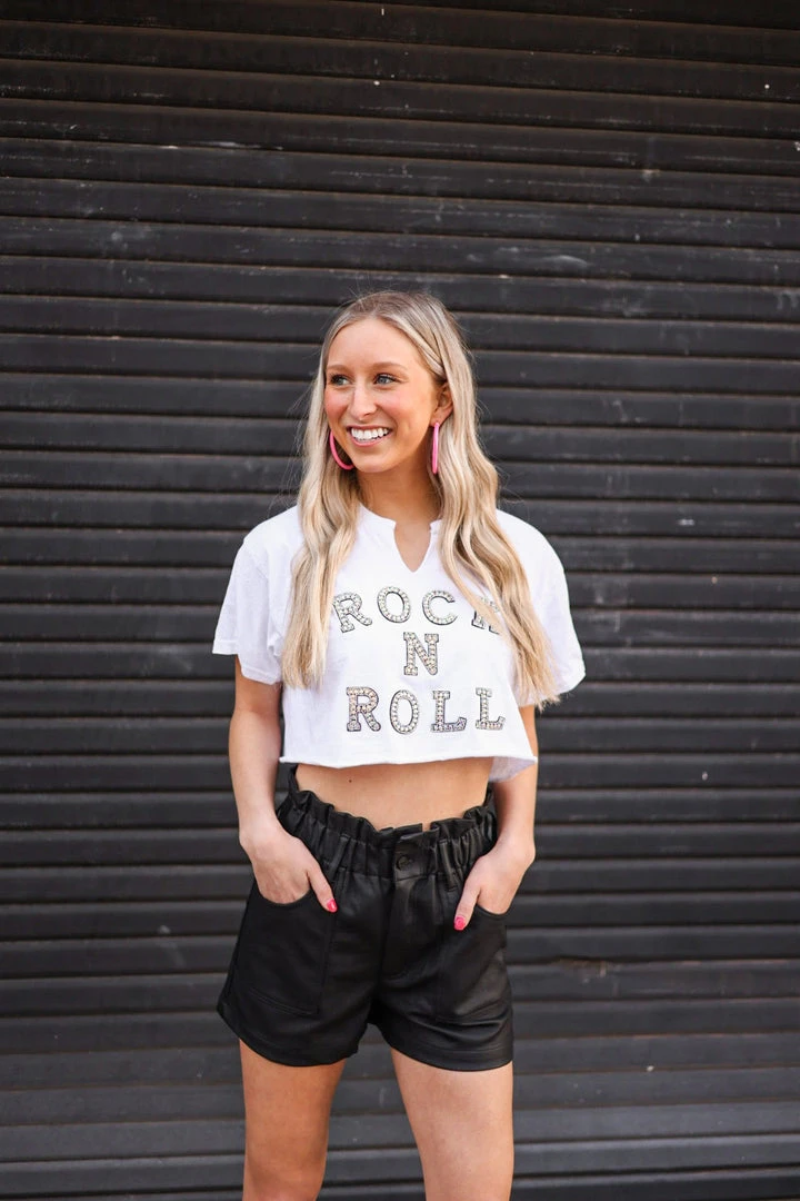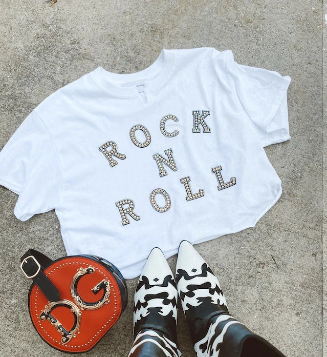 One of our favorite patch graphic tees! This fun rhinestone patch cropped tee is a must have for any Rock N Roll fan. We are loving the bling on this tee… pair it with your favorite jean shorts and star sneakers or boots for a fun and trendy look.