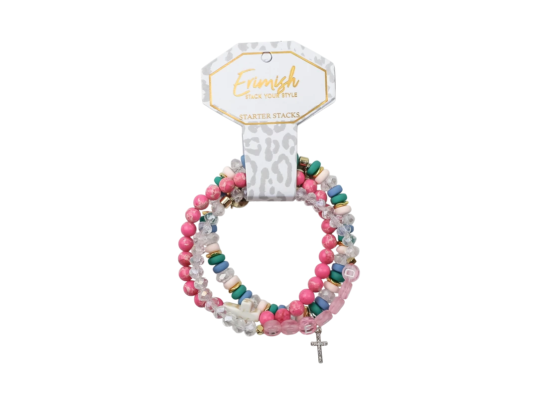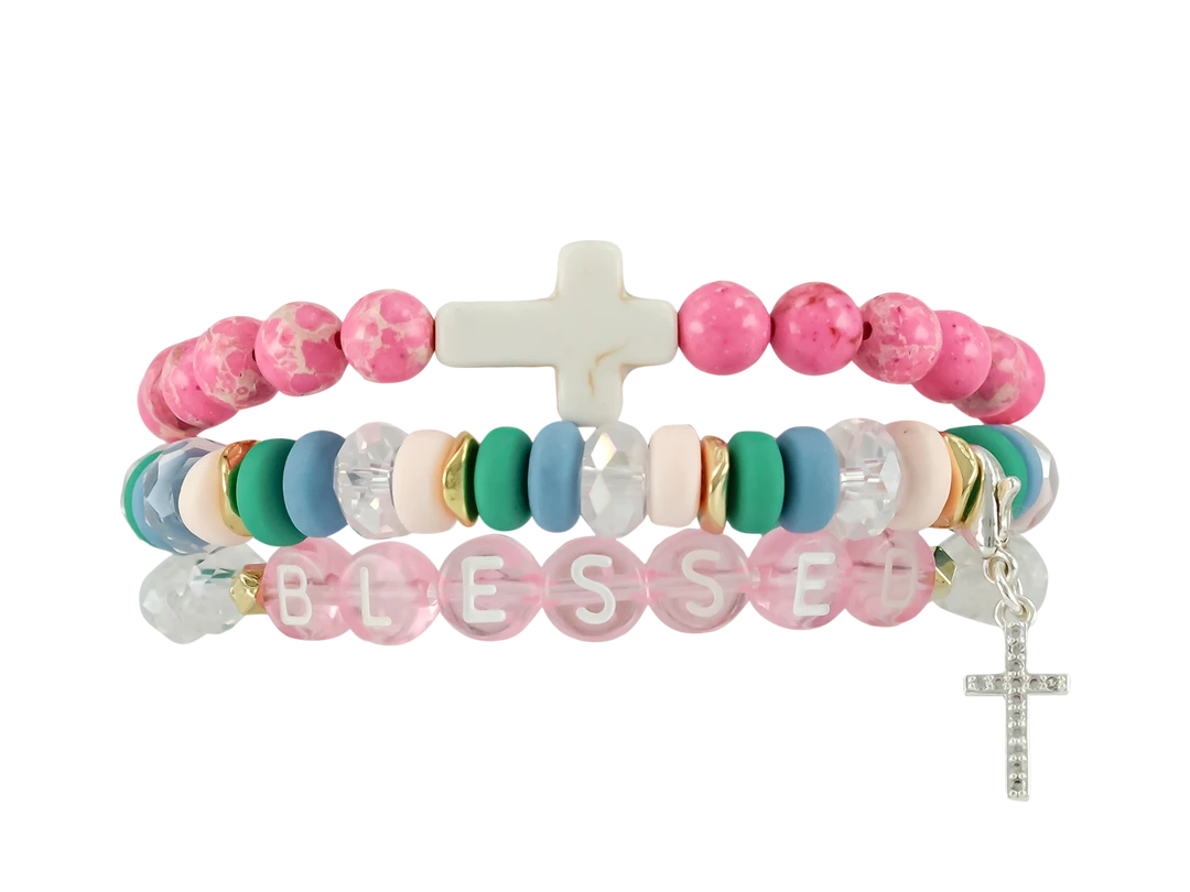 This stack features a gorgeous combination of pink, mint & blue colored beads! This blessed cross bracelet makes the perfect gift!