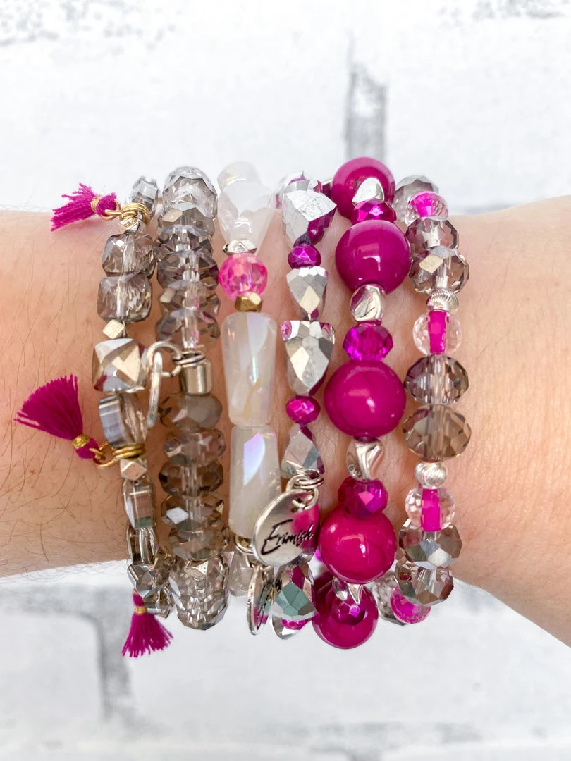 - This stack features a gorgeous combination of magenta pink, grey and white colored beads.