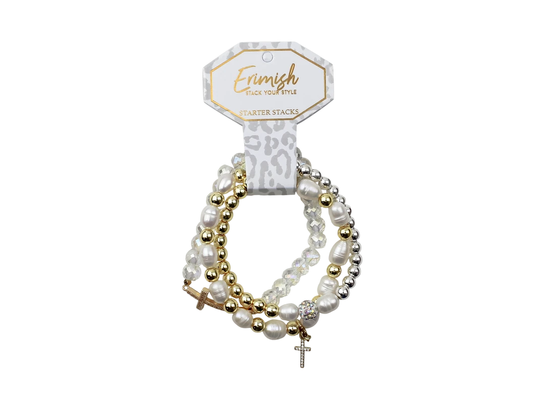 - This stack features a gorgeous combination of white, gold and silver colored beads!