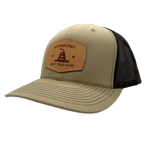 Design: Badge/Banner Style Leather patch and inspired by the Gadsden Flag; with “Southern Strut” above and “Don’t Tread On Me” below with the Gadsden Flag snake in the middle.