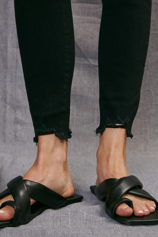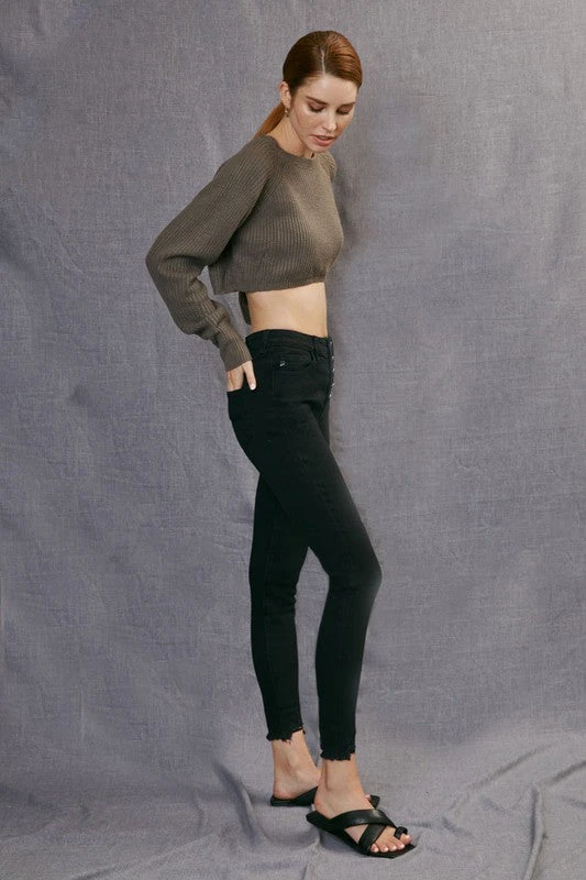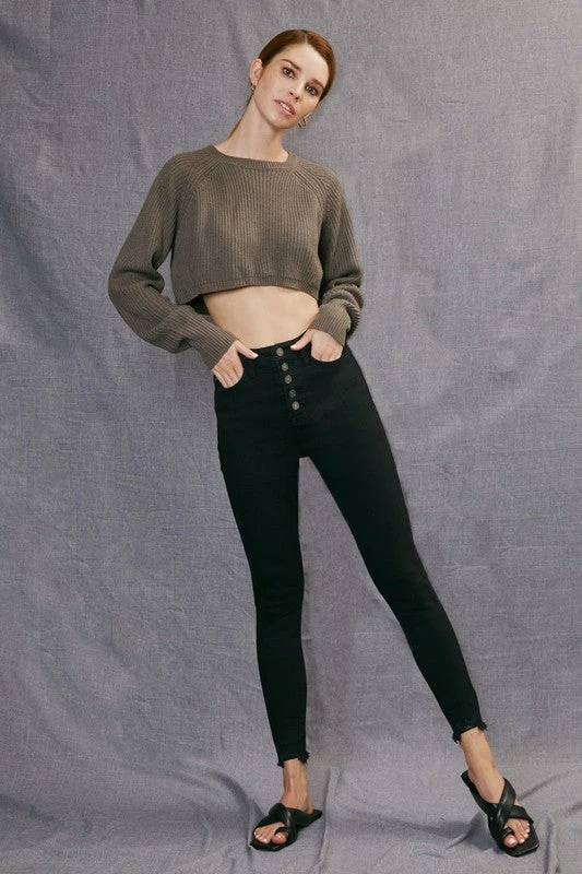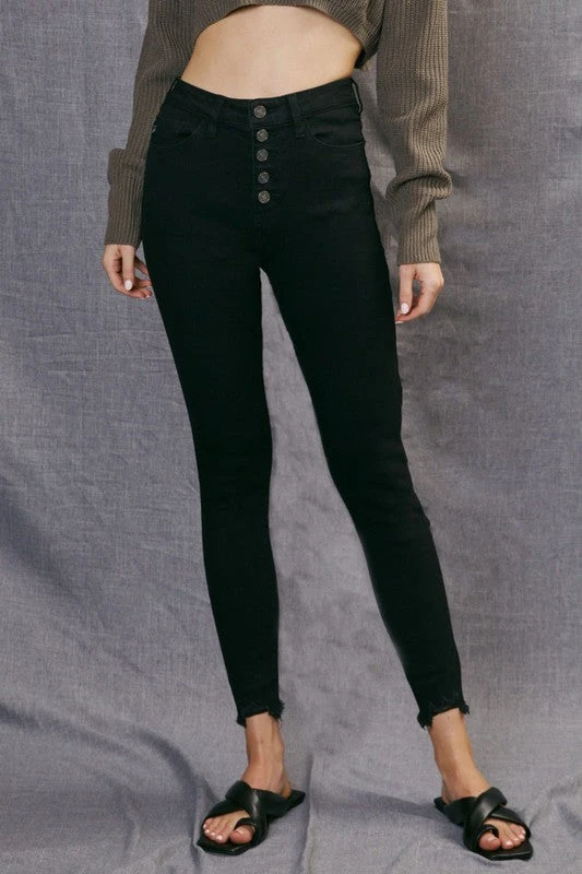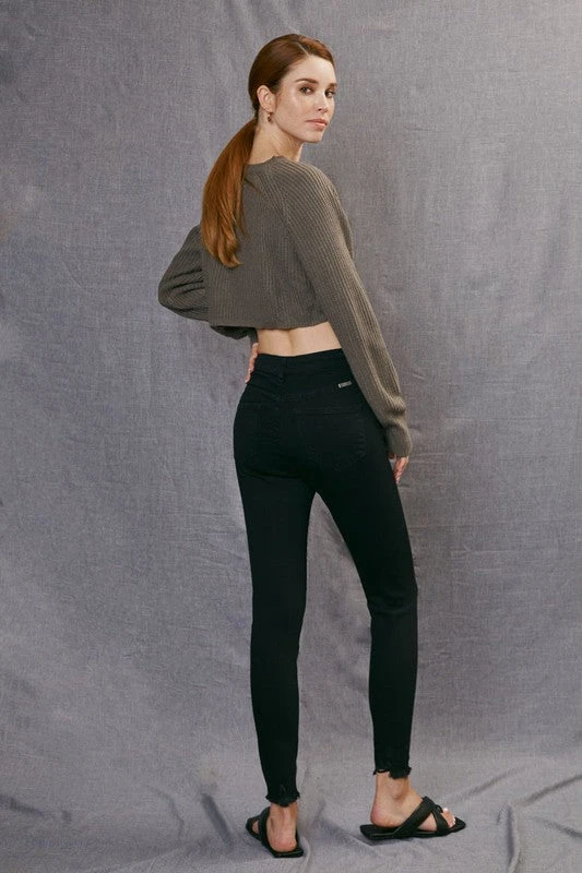 These trendy skinny jeans are such a must-have style for any season! We love the timeless black color. The perfect black pants with a raw hem line for a trendier style. It’s so easy to wear this style with a variety of tops, love them with a simple tee and a cardigan.