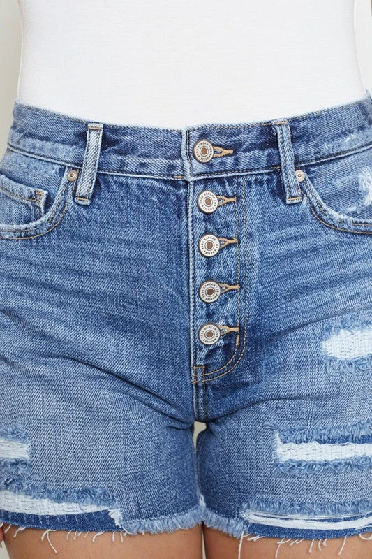 Love these cute medium wash denim shorts. They are perfect for any summer occasion! We love the patched distressed look – you can easily style it with any tops or tanks and just throw on your favorite sneakers or sandals for a casual trendy look. The high waist style and button fly are a cute combination.