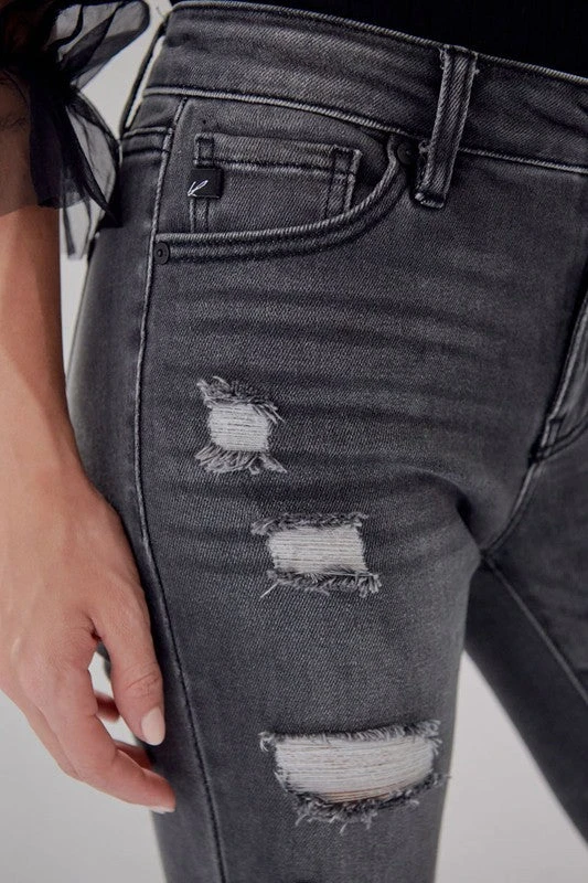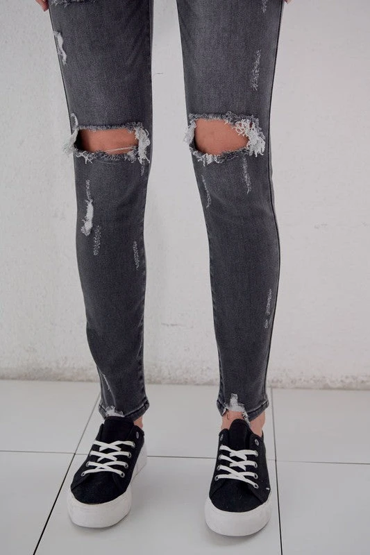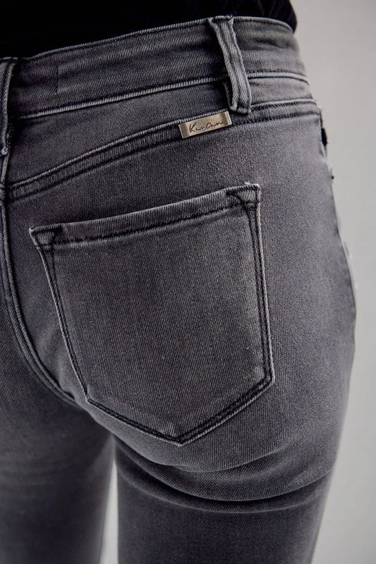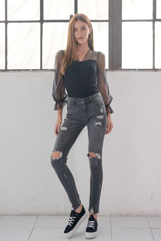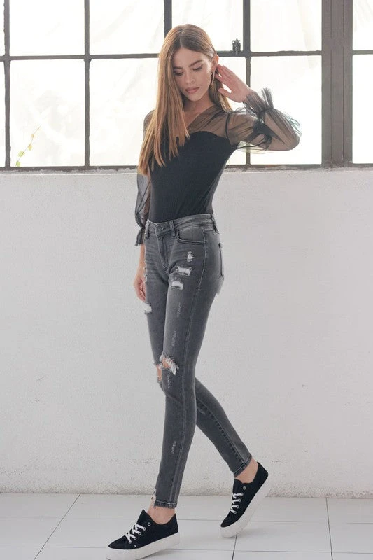These trendy skinny jeans are such a must-have style for any season! We love the washed light black color. The perfect black jeans with distressing for a trendier style. It’s so easy to wear this style with a variety of tops, love them with a simple tee and a shacket.