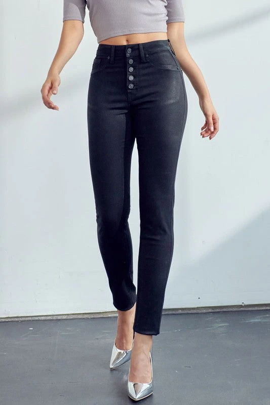 These trendy super skinny jeans are such a must-have style for any season! We LOVE the shimmer coating on the black denim. They are the perfect black pants to dress up, or add a graphic tee and leather jacket for a more edgy look. With the button fly, high rise, and just the right amount of shimmer, these babies are soon to be your new favorite!