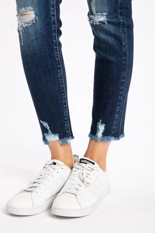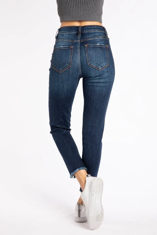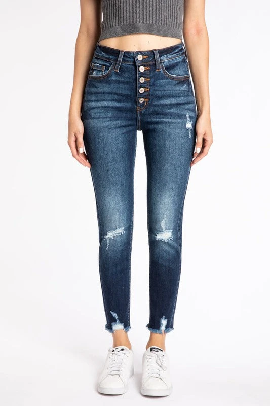 Dark wash high rise button fly skinny jeans with frayed hem at the ankle