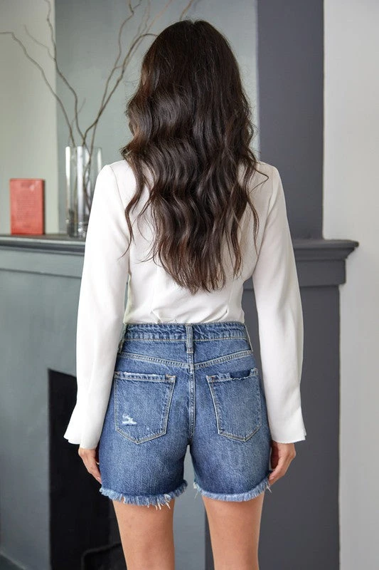 Love these cute dark wash denim shorts. They are perfect for any summer occasion! The distressed look is so cute and you can easily style them with any top or tank, just throw on your favorite sneakers or sandals for a casual trendy day out.