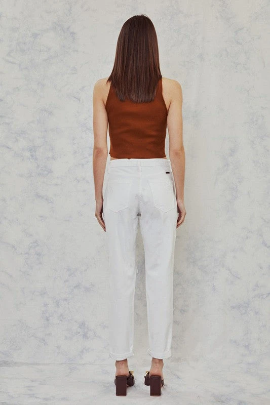 These trendy high waisted mom fit jeans are such a must-have style for any season! We love the timeless white denim and the distressed details. It’s so easy to wear this style with a variety of tops, layering tanks, and cardigans!