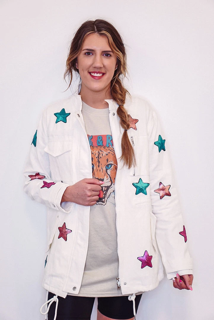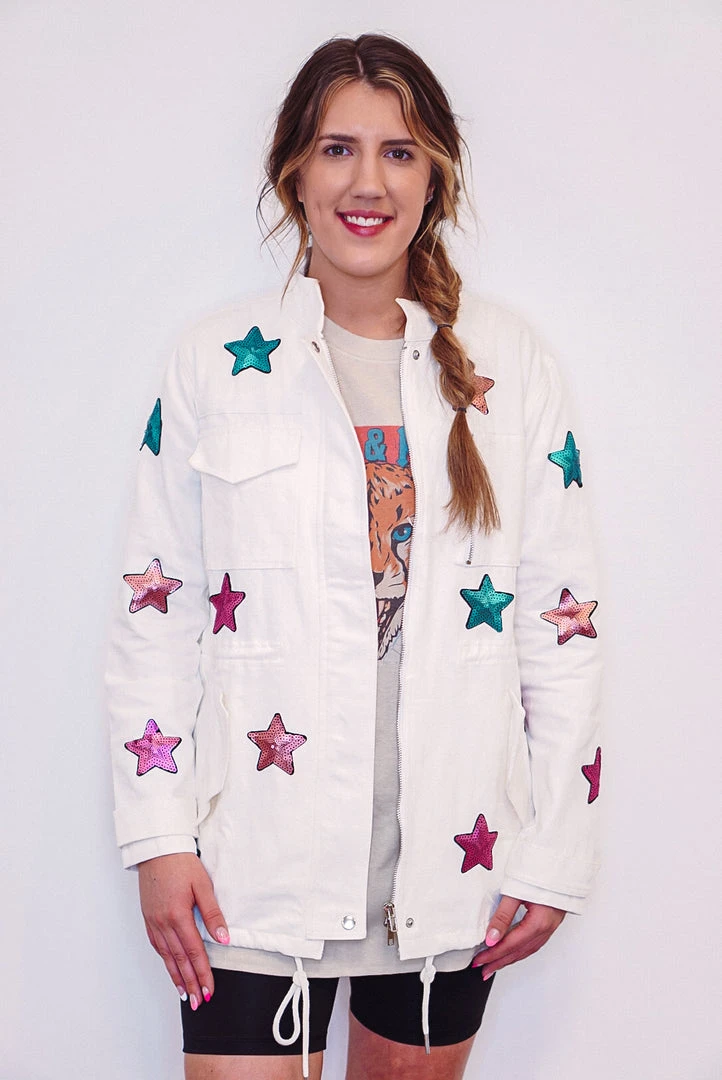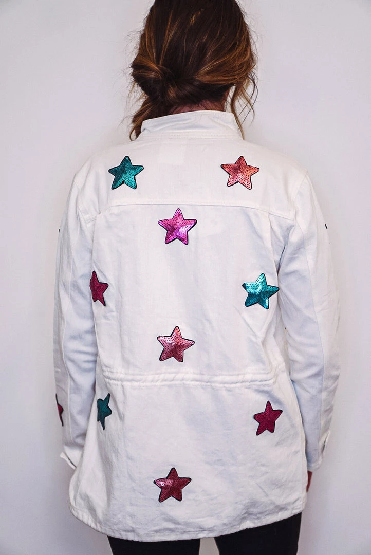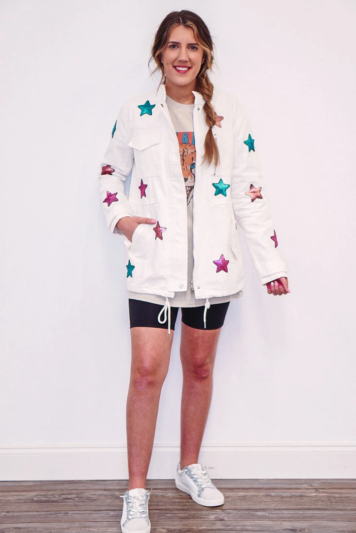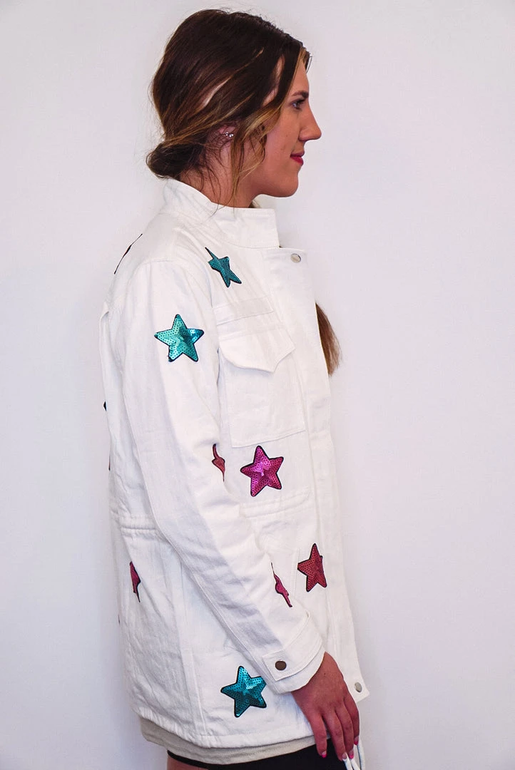 Buddy Love Alyssa cargo jacket in white with pink and teal pastel sequin stars