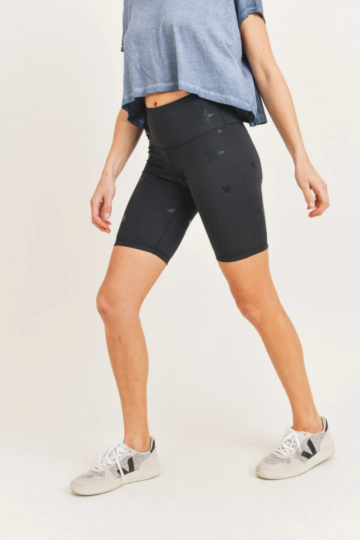 Our best-selling Black Star foil leggings have been reincarnated into these starry biker shorts! Constructed from solid-colored polyester-spandex fabric and decorated with black star foils, these shorts also feature a high waistband with a discreet phone pouch. Pair these with your favorite tee or sweatshirt and sneakers for a comfy and trendy look.