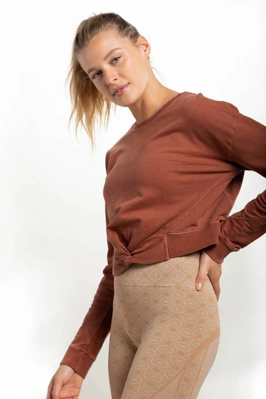 This lightweight pullover is perfect to wear with your favorite Mono B activewear. It is a cropped style and features mineral washed terry fabric with a twisted accent on the front, cuffed long sleeves, and a crew neckline.