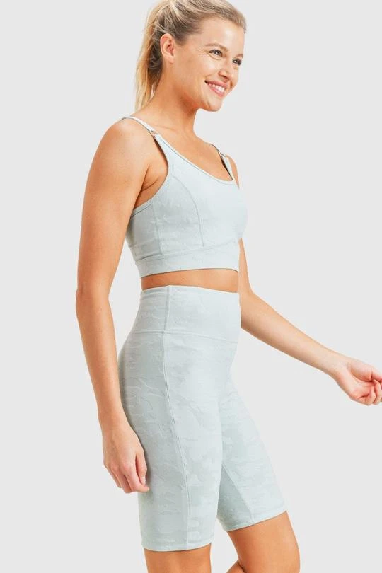 With adjustable bra straps and a half-circle cutout on the back, this Textured Camo print (a Mono B exclusive fabric) sports bra straddles the line between cute and fierce. SHOP the matching biker shorts HERE!