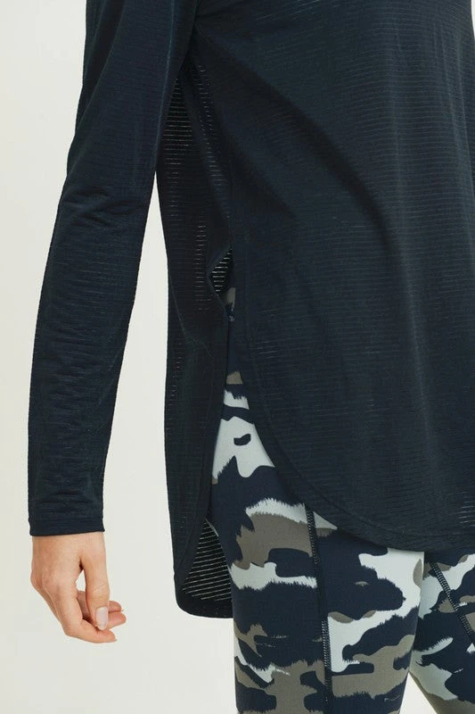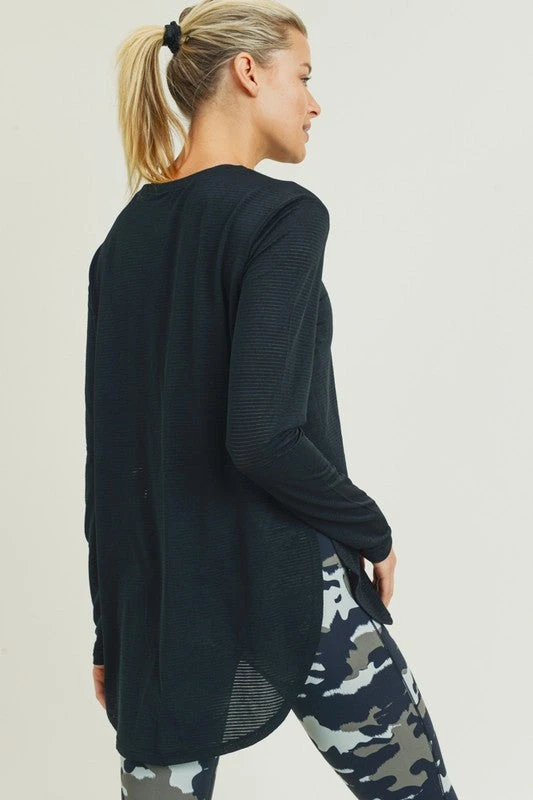 This flowy top is constructed using all-over exclusive Mono B ribbed mesh fabric. It features tulip sides with slits as well as hi-low, asymmetrical cut. Perfect to layer over your Mono B activewear or under your favorite shacket!