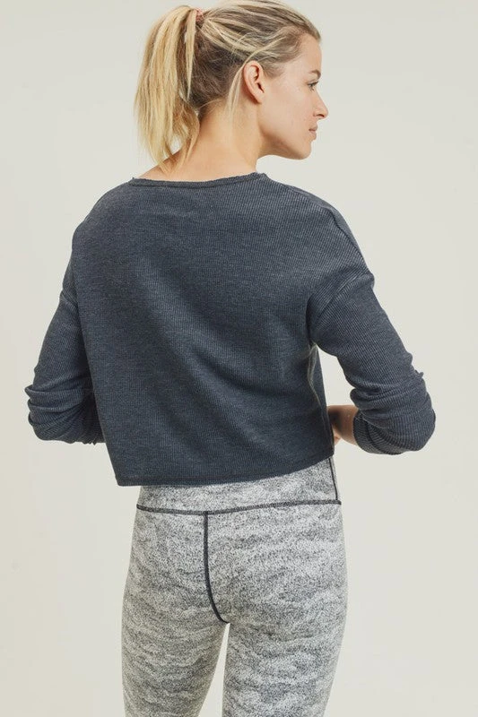 With is cropped length, notched collar, and long sleeves, this waffle knit top is perfect to layer over your Mono B activewear, or pair it with jeans for a street-chic look.
