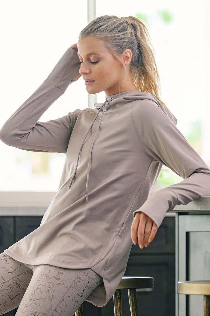 Constructed from recycled polyester (woven with spandex for four-way stretchiness), this hoodie top cuts a relaxed silhouette with a high neckline, a drawstring feeding through grommets, long sleeves with thumbholes, and a curved hemline for a flowy look.