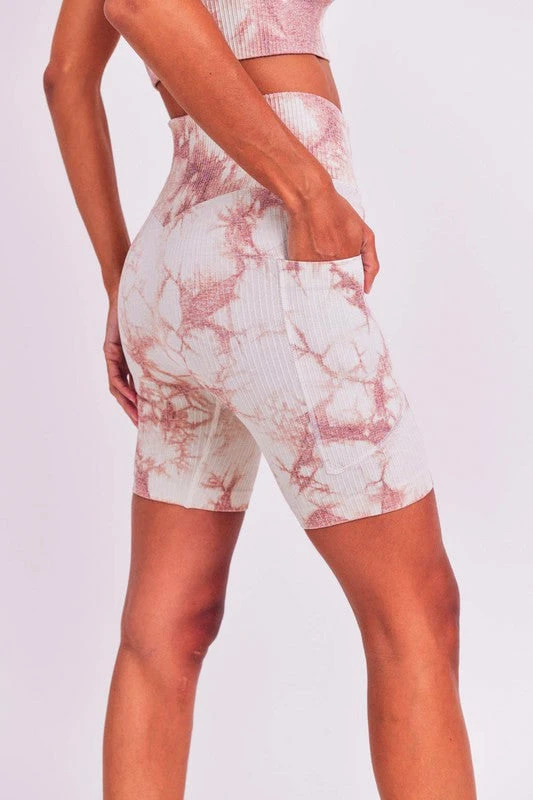 These seamless biker shorts feature an all-over tie dyed finish in a ribbed construction, as well as a high waistband for abs support (with a flattering sweetheart back) and side pockets for your essentials. These adorable mono b athletic biker shorts are sure to become your new favorite! Pair with the matching sports bra for the perfect outfit.