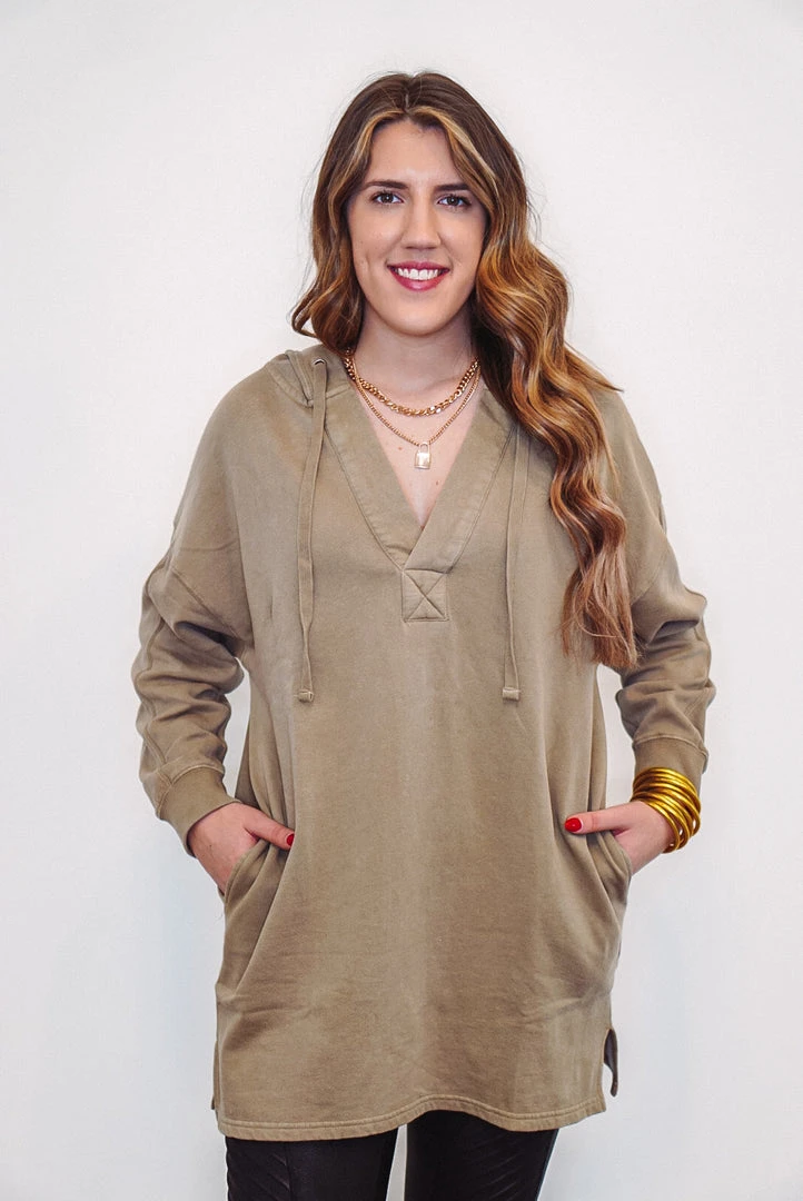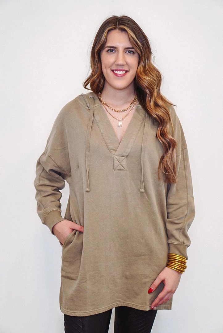 This mineral washed mushroom pullover feels just as cozy as it looks. Featuring a longline silhouette, a V-neck front, hoodie top (with drawstring closure), long sleeves, and brushed fleece inner shell. Super comfy!