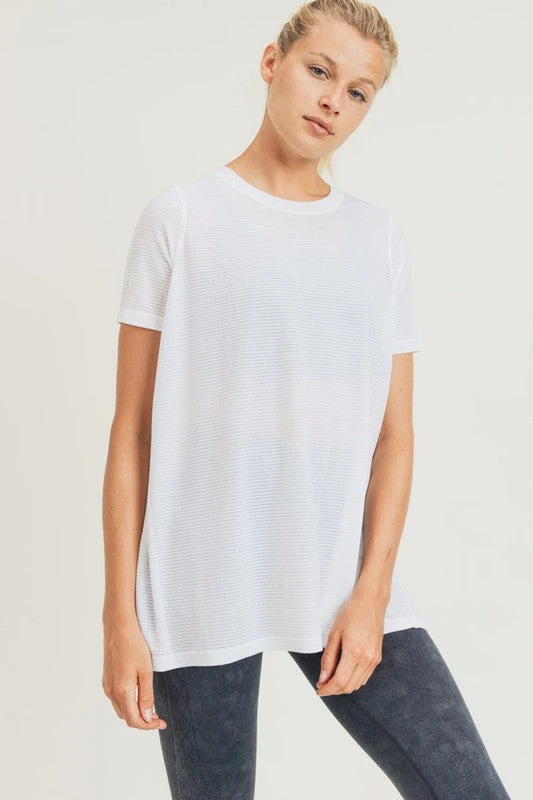This longline top is perfect to layer over your Mono B activewear. The four-way stretch, striped mesh fabric gives coverage whilst keeping keeping you cool during your activities. The keyhole cutout on the back is both functional and flirty.