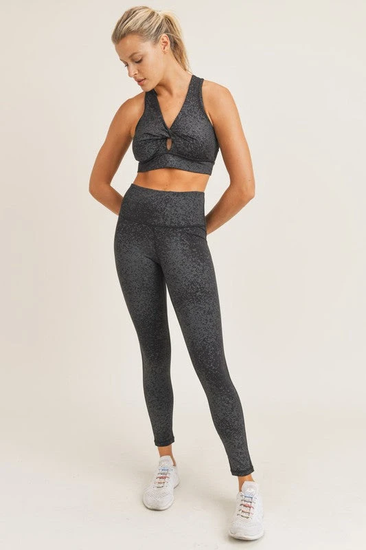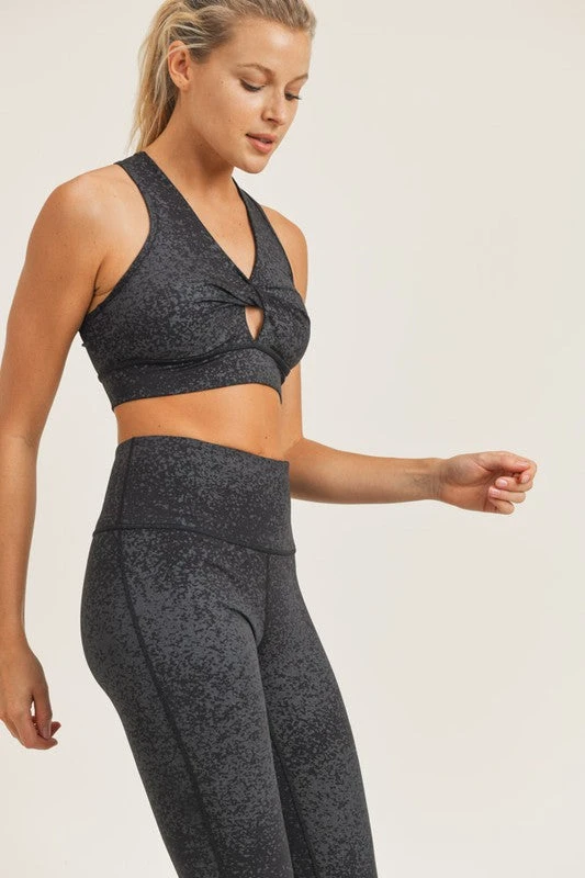 The cutest athletic sports bra! This racerback sports bra is constructed from a solid-colored, four-way stretch fabric with a foil layer in a unique flake pattern. The front has a twisted design with a peekaboo hole. Pair it with the matching flake foil leggings!