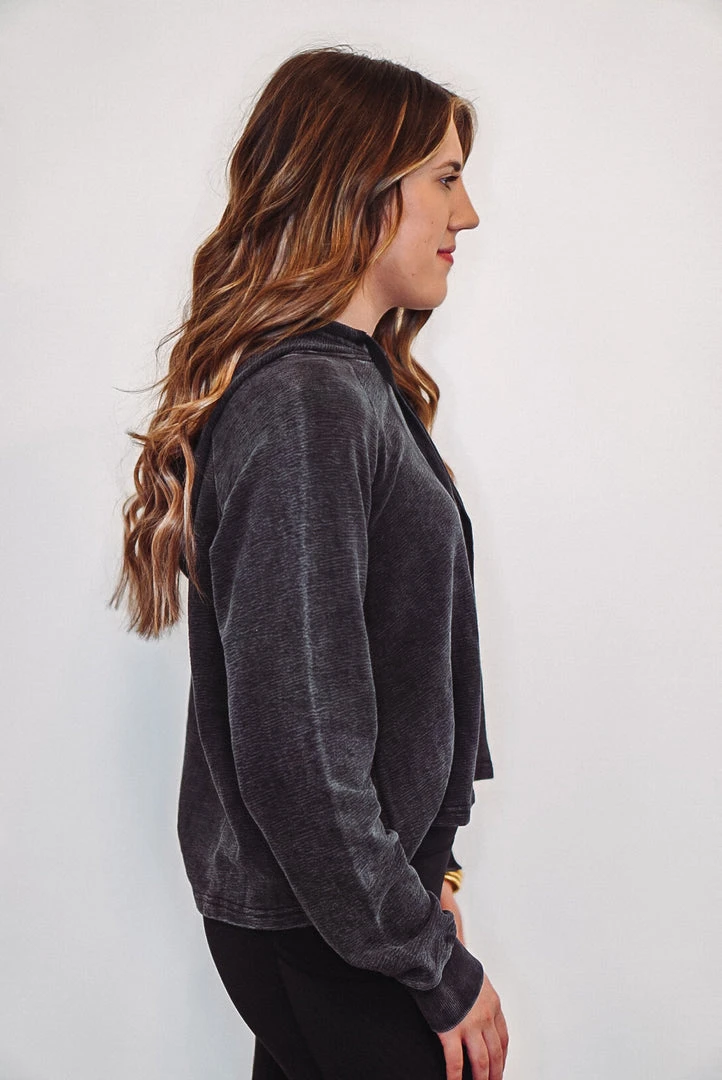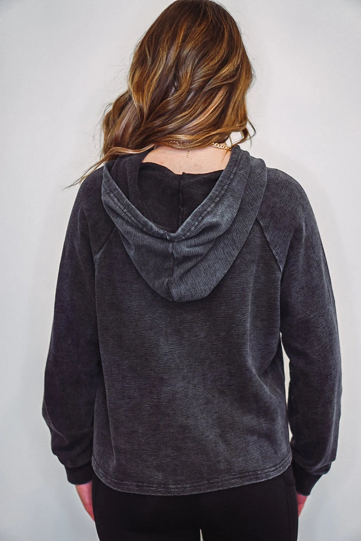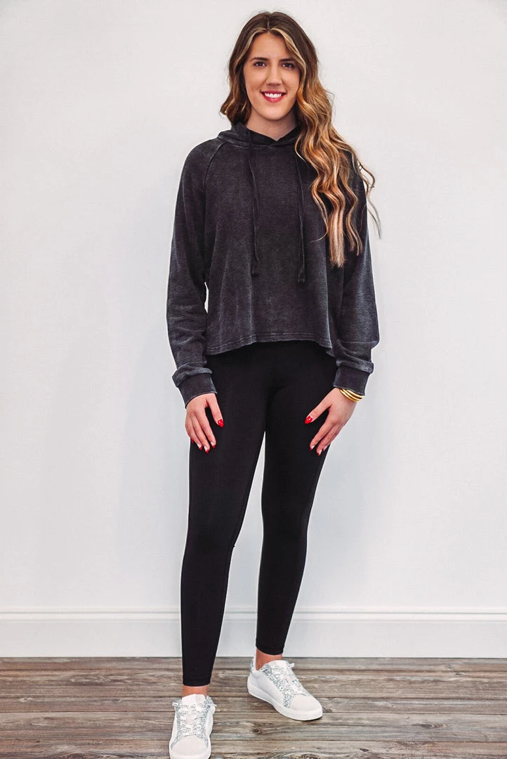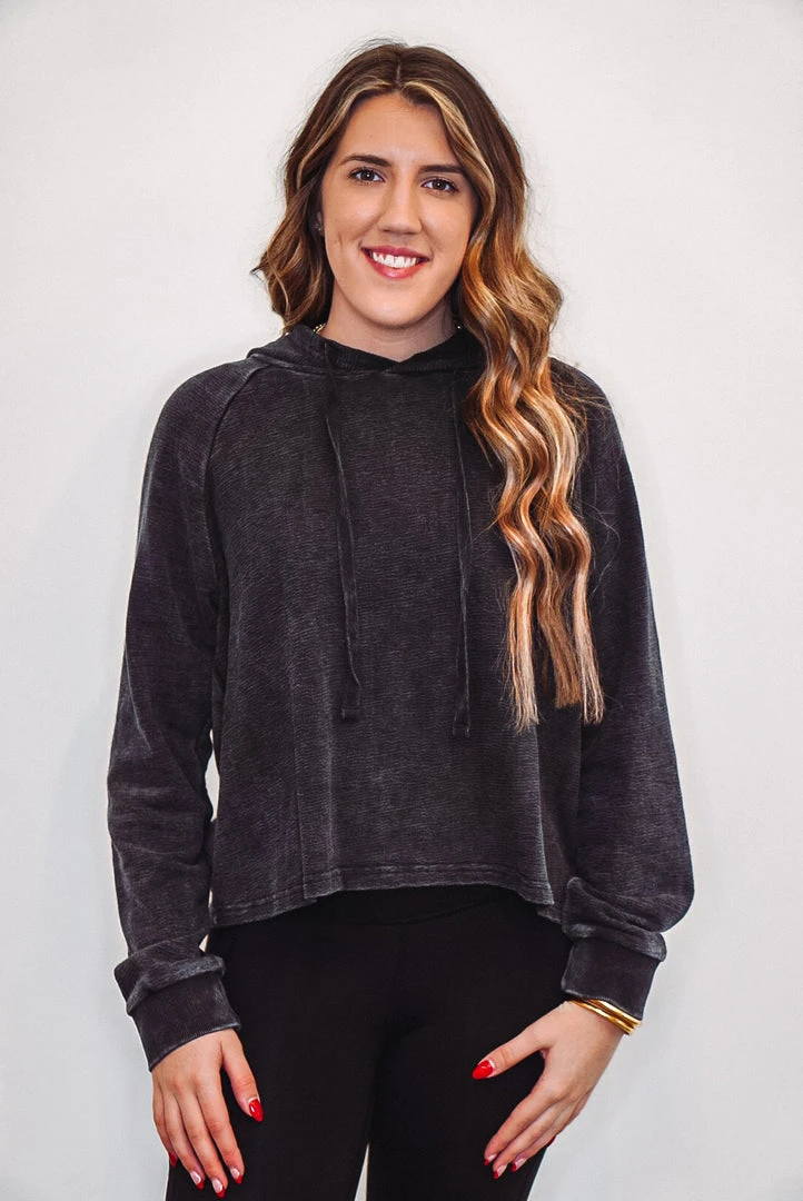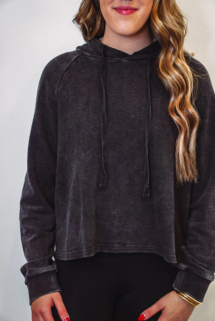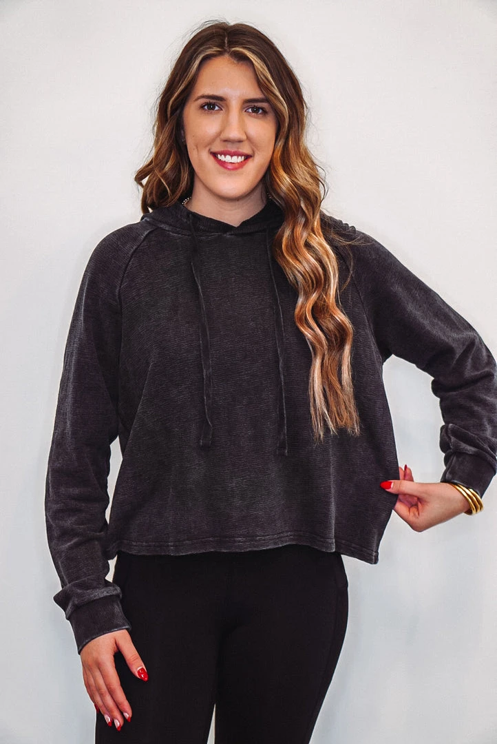This lightweight hooded pullover is perfect to wear with your favorite Mono B activewear or loungewear. It is a cropped style and features terry knit jacquard fabric, cuffed long sleeves, and a hood with a drawstring.