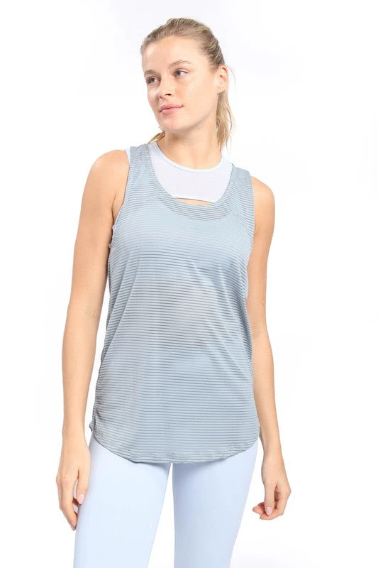 This extremely lightweight athleisure muscle top was made from sheer striped mesh fabric for extra breathability. It has a crew neckline, semi-curved bottom hem, and a pinched back for a more fitted look. We love, love, love!