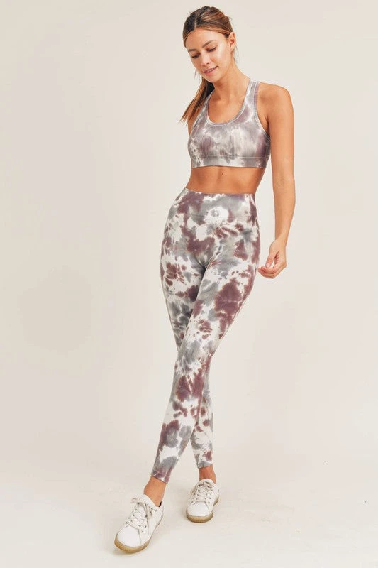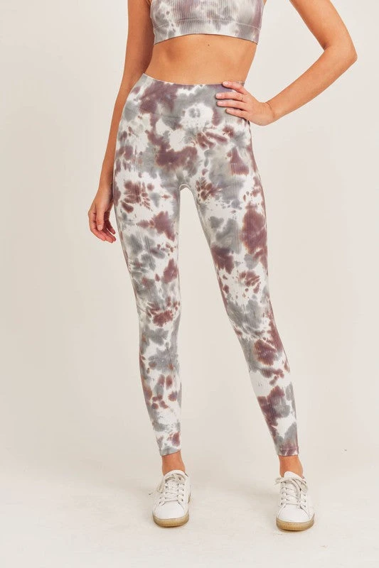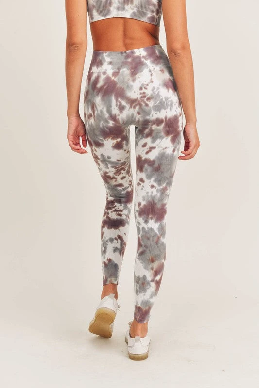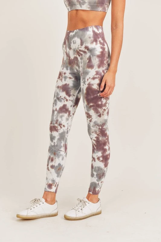 Mono B seamless ribbed tie dye leggings in grey, eggplant, brown, and ivory