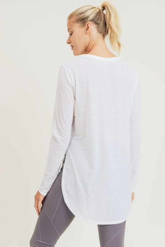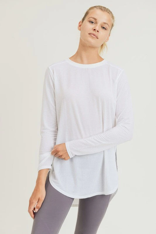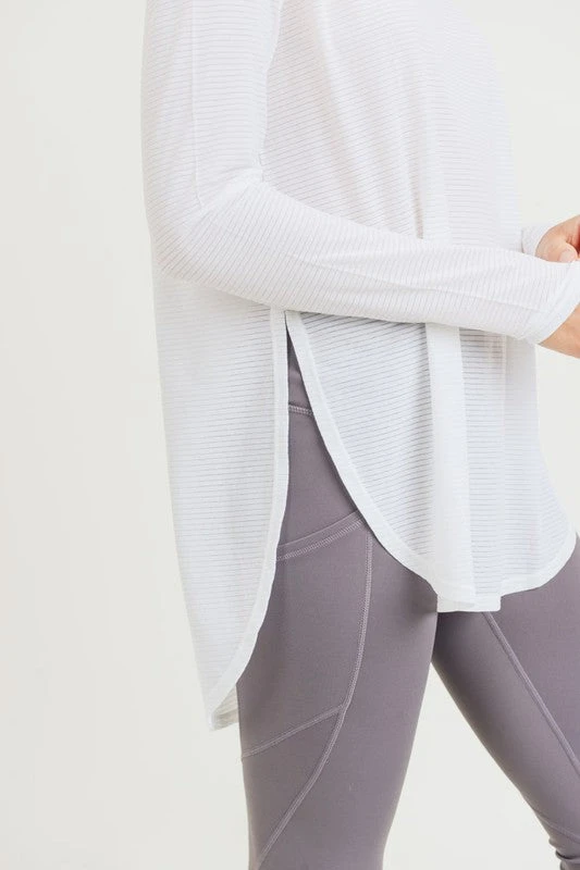 This flowy top is constructed using all-over exclusive Mono B ribbed mesh fabric. It features tulip sides with slits as well as hi-low, asymmetrical cut. Perfect to layer over your Mono B activewear or under your favorite shacket!