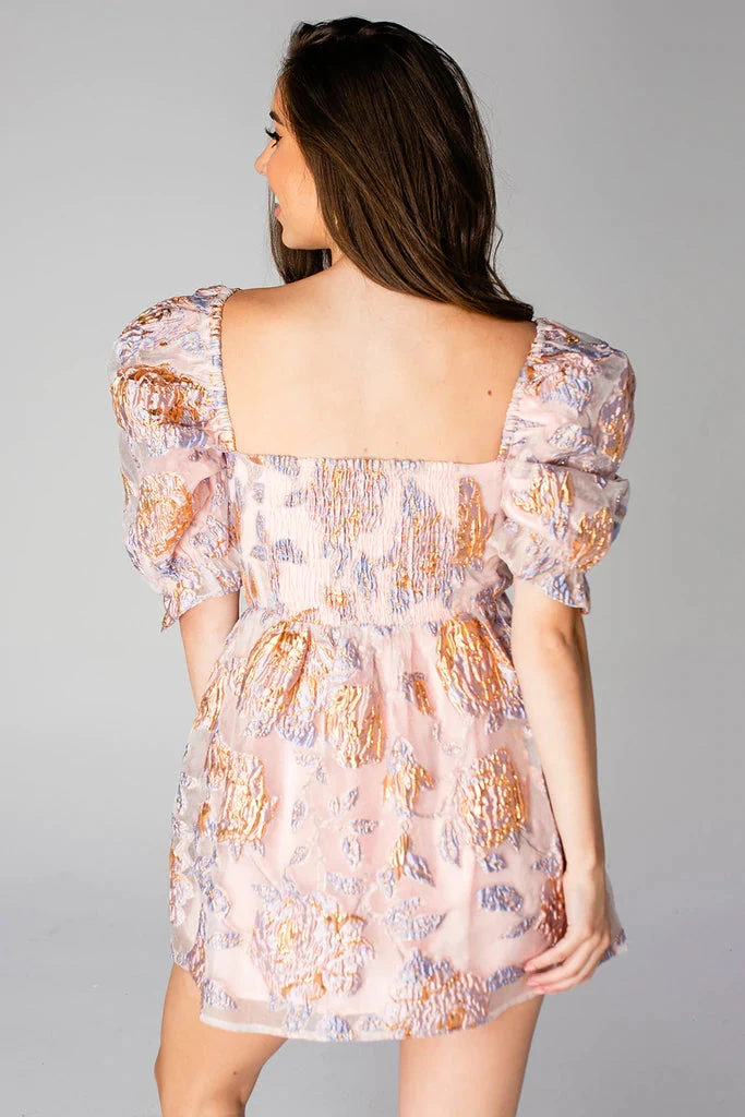 A #babecrew favorite is back for this spring season! The Colby Dress features a drawstring in the front to adjust to your comfort, a slight puff sleeve, and a smocked back to stretch around you. She looks great paired with a big earring and your favorite heels! Colors: dusty pink, blue, and metallic rose gold.