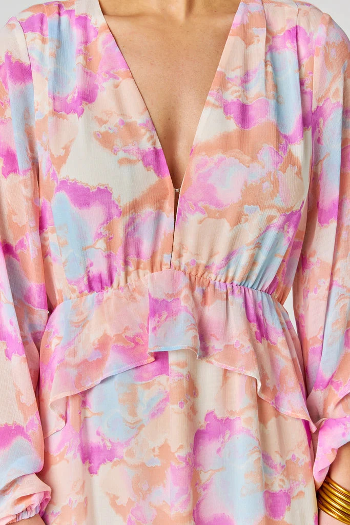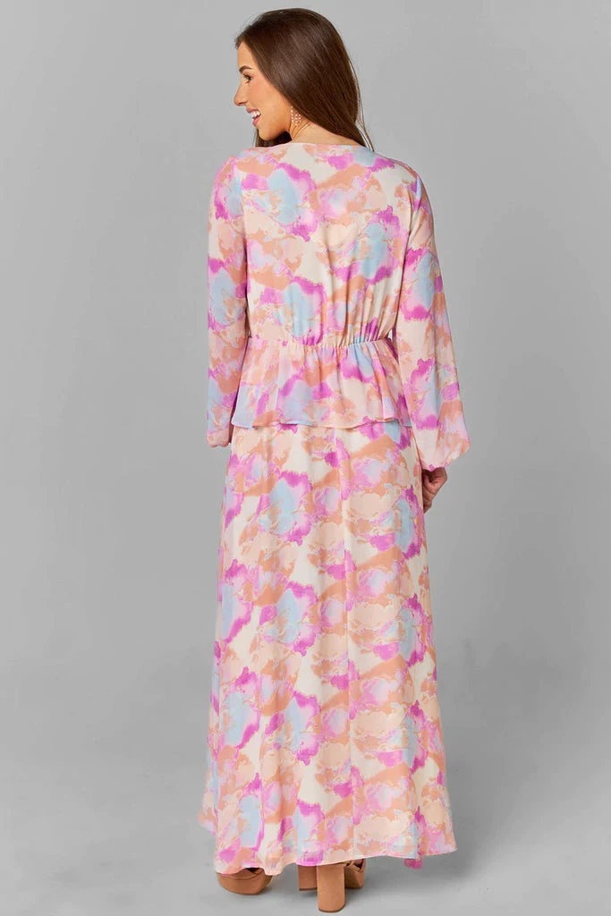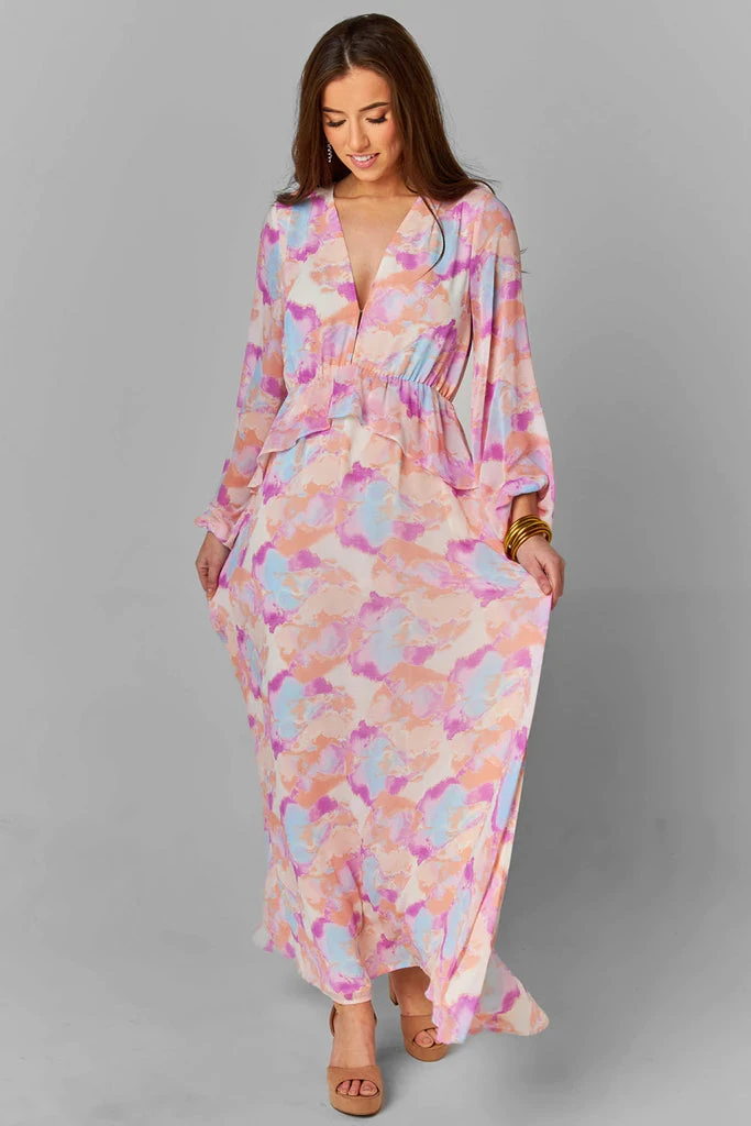 Dress to impress in our gorgeous Eden dress featuring long sleeves with elastic at the wrists, lightweight breezy fabric in our new dazed print, plunging neckline with hook closures, a fun ruffle at the waistline, and a simple silhouette that cascades into a straight floor-length hemline. Absolute perfection!
