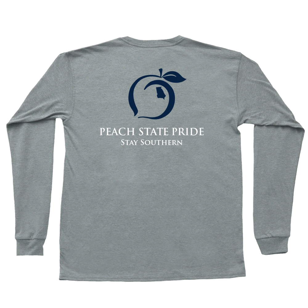 The Peach State Pride cotton long sleeve pocket t-shirt with a classic fit featuring Peach State Pride Classic Stay Southern Peach Logo.
