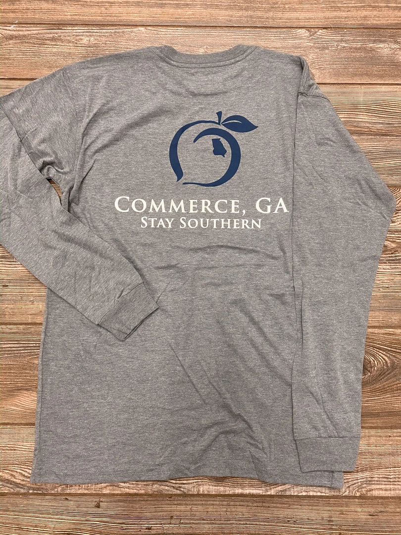 The Peach State Pride cotton long sleeve pocket t-shirt with a classic fit featuring Commerce, Georgia Stay Southern artwork.