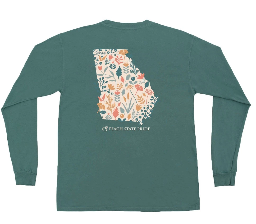The Peach State Pride cotton long sleeve pocket t-shirt with a classic fit featuring Floral State Design.