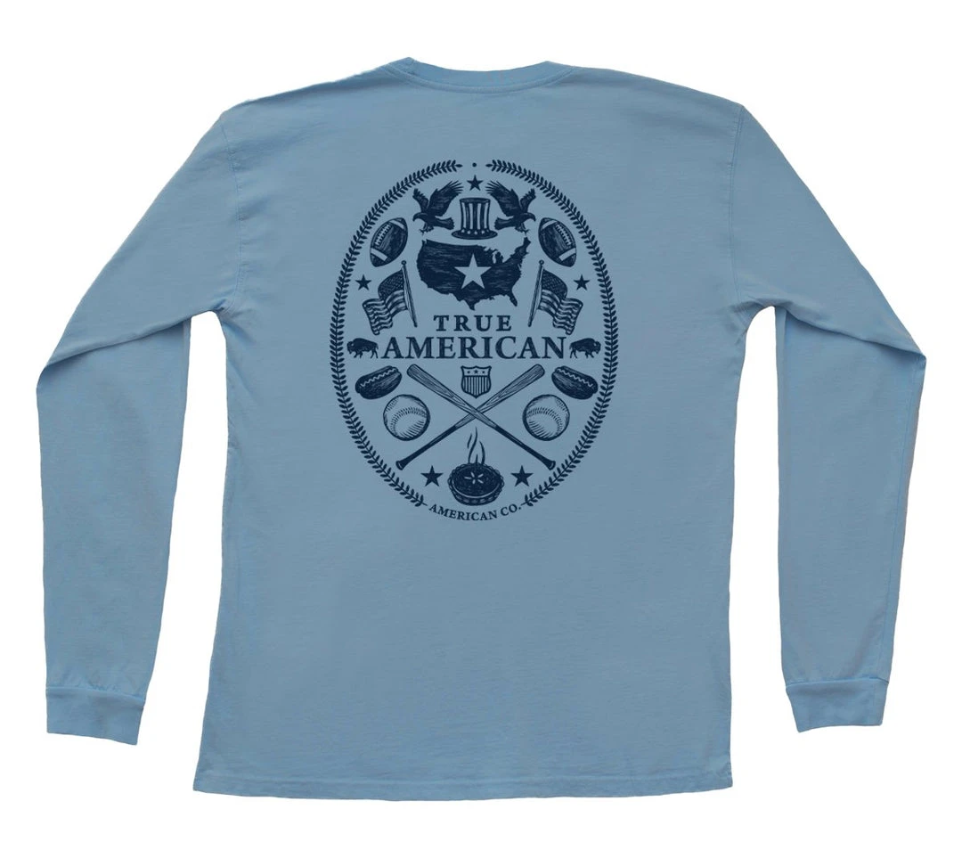The Peach State Pride cotton long sleeve pocket t-shirt with a classic fit featuring True American Montage.