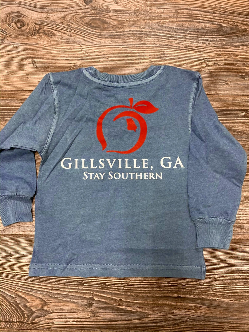The Peach State Pride cotton long sleeve pocket t-shirt with a classic fit featuring Gillsville, Georgia Stay Southern artwork.