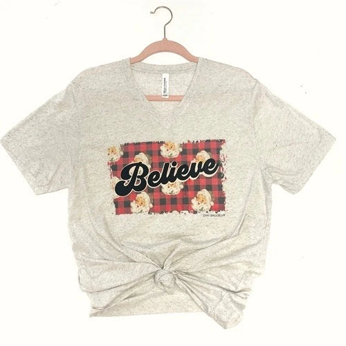 It’s time to rock your fabulous Christmas graphic tees. Santa Claus believe flecked oatmeal color. Features ‘Believe’ in black velvet