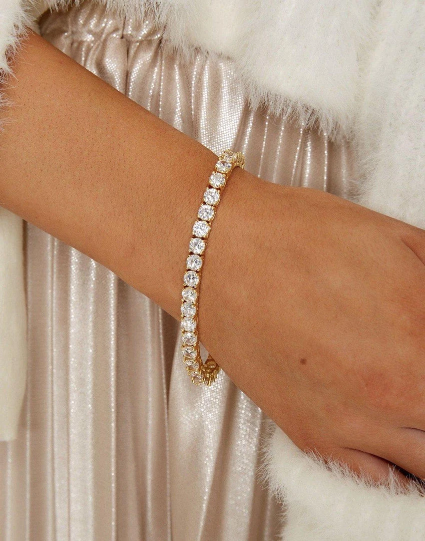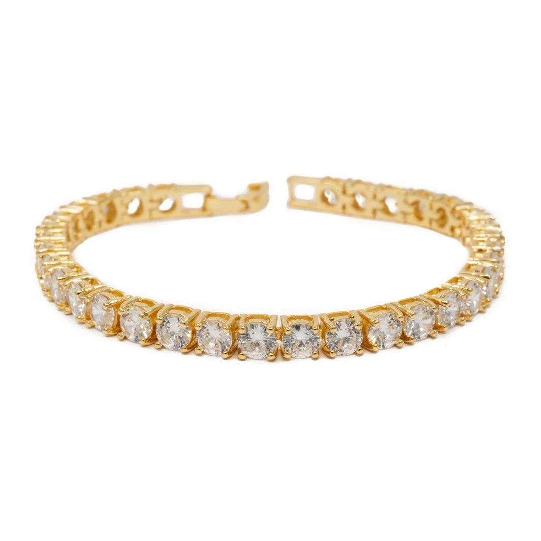 This beautiful gold bracelet features a box intertwined chain with 14k gold plating and embellished crystal detailing. Sophistication without the sophisticated price tag! 14k gold plated over sterling silver cubic zirconia tennis bracelet. This bracelet measures approximately 2.5″ wide. • Made in USA
