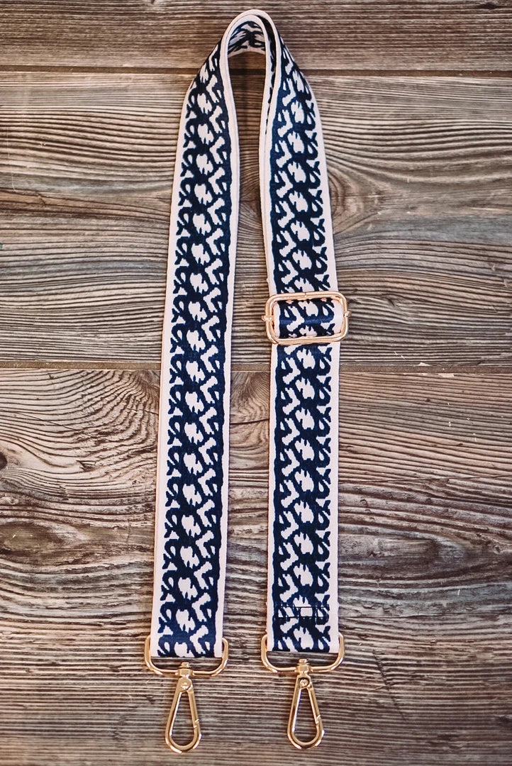 Only the cutest navy and baby pink printed guitar straps to match on of our interchangeable crossbody bags!