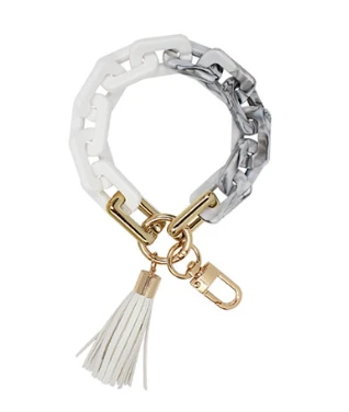 Such a fun and cute keychain! Resin chain link bracelet keychain featuring white links with white and black marbled links and a white tassel. Love, love, love!