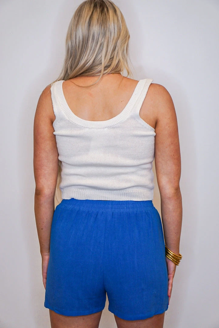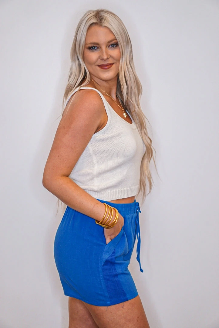 Cobalt blue linen elastic waistband and drawstring shorts